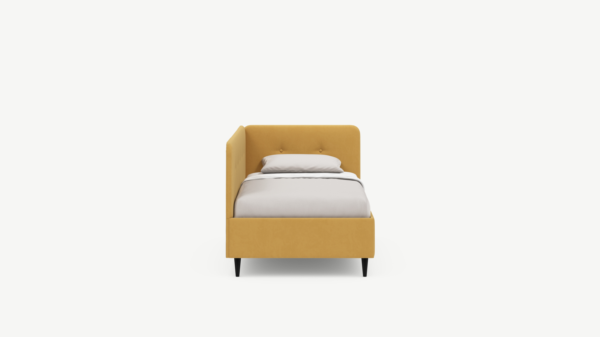 Угловая односпальная кровать MOON FAMILY 1253 с мягкой спинкой и изголовьем обладает округлыми формами, привносящими в интерьер нотки нежности. Изголовье, украшенное пуговицами, добавляет окружающему пространству шарм и уют. Высокие опоры придают кровати визуальной легкости, а также обеспечивают удобство во время уборки.